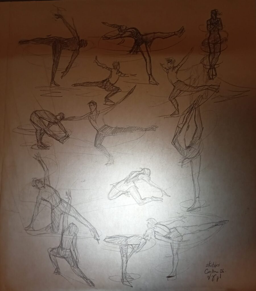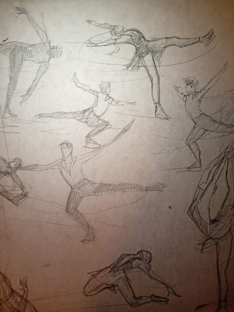 At the Winter Olympics, however, figure skating is that sport which, like gymnastics, brings together elements of gymnastics and dance, mediated by skating and by the medium of ice. Living in Canada, it is impossible not to let myself be completely absorbed by the sport in my own visual artistic practice. In the next three texts, I will share with you sketches and drawings (I won’t have time to make actual paintings, but who knows, maybe some elements will end up “leaking” into a future series), while also developing historical aspects of the sport, reflections on high performance in culture by creating a dialogue between sports and the arts, and finally, discussing the geopolitical importance of the Olympics, historically as well. I will weave the texts with personal comments on the results, if that seems interesting and relevant, or simply to honor the athletes.